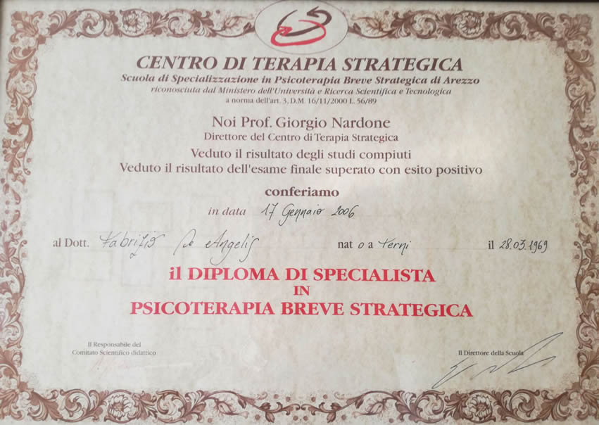 Dopo la laurea in psicologia (indirizzo clinico e di comunità), conseguita presso l'Università degli studi "La Sapienza" di Roma, mi sono specializzato in Psicoterapia Breve Strategica presso la Scuola di Specializzazione di Arezzo diretta dal Prof. Giorgio Nardone, e riconosciuta dal Ministero dell'Università e della Ricerca Scientifica.
