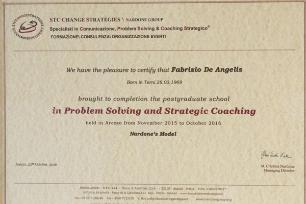 Dopo la specializzazione in Psicoterapia Breve Strategica ho frequentato il Master in Problem Solving Strategico e Coaching Strategico presso lo Strategic Therapy Center di Arezzo.